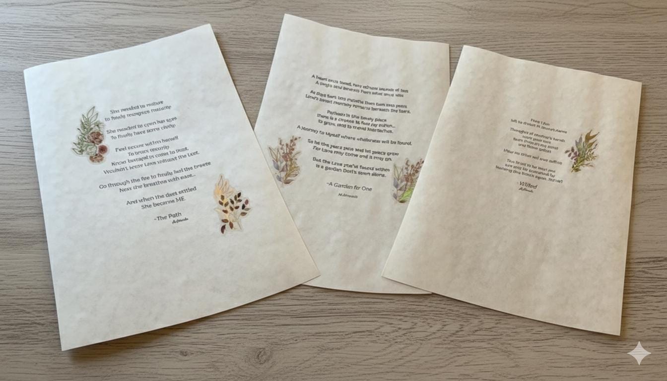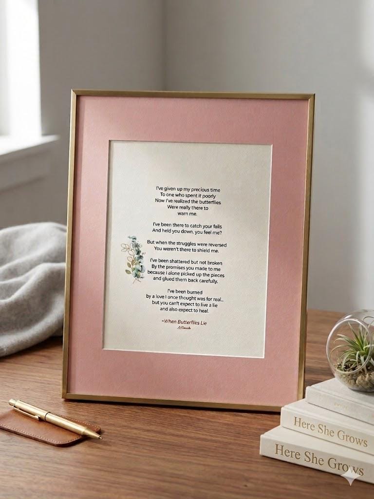 Bring the heart of Here She Grows into your home. These selected prints are quiet reminders of the seasons we go through and the strength we find along the way. Each poem is printed and colorfully matted so it is ready to frame and find a special spot on your wall.